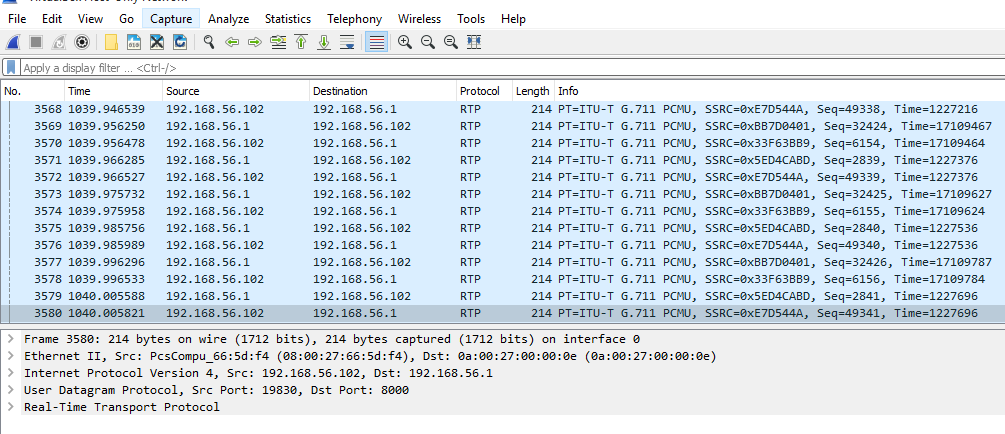 Figure 10: Wireshark application capturing RTP packets from ongoing voice conversation