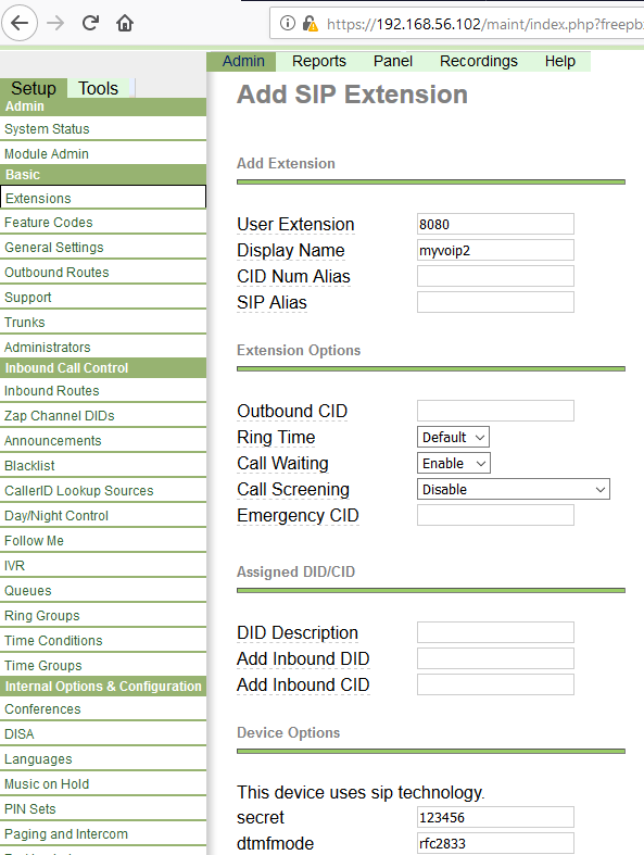 Figure 4: Creating user extension 8080 on Trixbox server