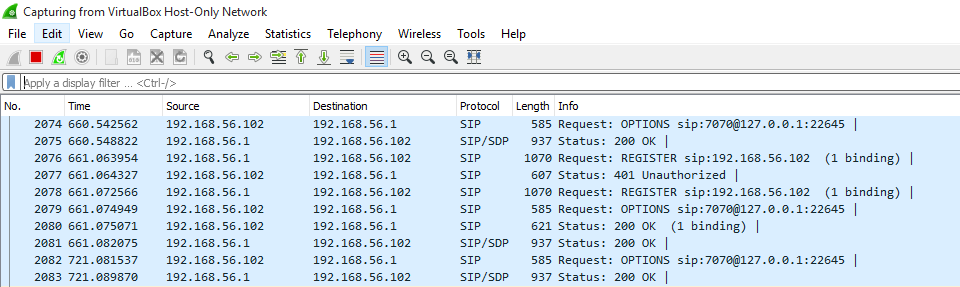 - Wireshark was launched to monitor SIP packets from the softphones just after they’ve been configured