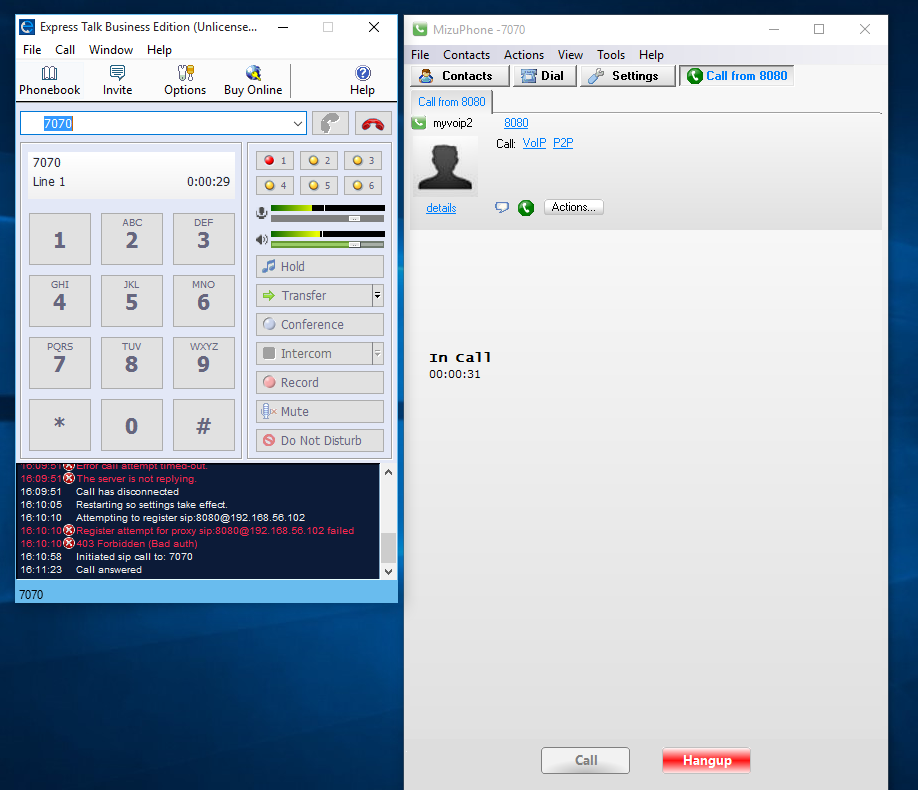 - User extensions 7070 and 8080 were created on the Trixbox server with IP 192.168.56.102. The extensions were then set up on the SIP softphones Mizu and Express Talk