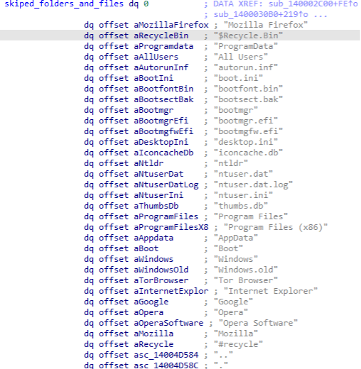 Some specific folders can't be encrypted and damaged during the ransomware execution, or the entire operating system breaks. A list of target folders and files is also coded in a wide char array by Rook operators, as observed in Figure 9.