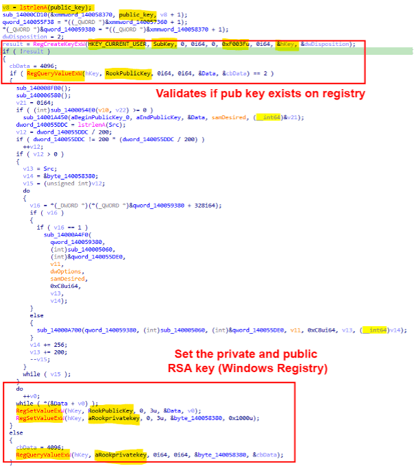 One of the main tasks before starting the encryption process is the creation of the RSA asymmetric keys. The ransomware uses the RegCreateKeyExW API call to open the Software subkey available on "HKEY_CURRENT_USER." If the public key exists, Rook uses it. On the other hand, an RSA key pair is generated: "RookPublicKey" and "aRookprivatekey," and the values are stored on the Windows Registry. The described process is illustrated in Figure 5 below.