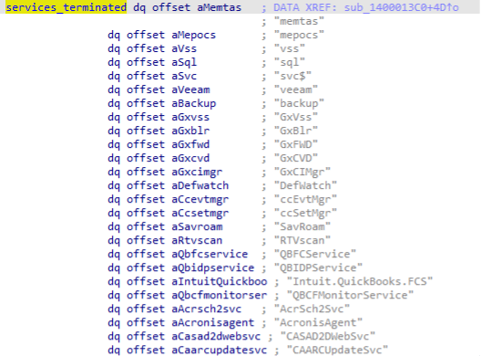 As observed in other ransomware families, Rook has hardcoded a list of services to be terminated before starting the encryption task, preventing, thus, any errors affecting the encryption process.