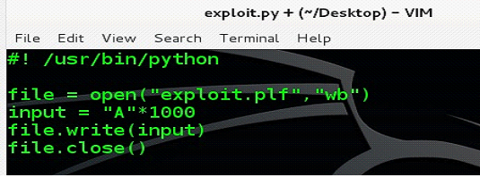 First, we have to verify the buffer overflow vulnerability in the software. So, let's create a file with PLF extension and enter 1000 A's in it. PLF is the extension of the playlist file for the DVD player software. Now, let's write the Python script on the Machine B that will generate the exploit.plf file, later on we will use this script to generate the shell code also.