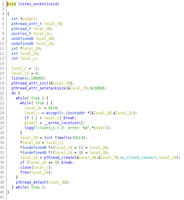After loading the configuration into the memory, the daemon starts, as presented in Figure 6 above (start_demon() function). A socket and a listener to accept new clients are created. Create socket (Figure 8) and listener function (Figure 9) are presented in the next images.