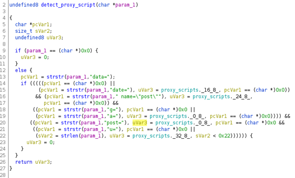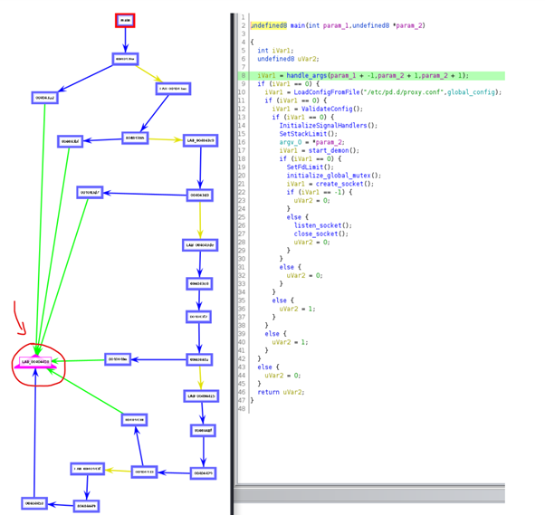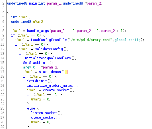 In detail, all the mentioned verifications are performed based on the parsing of a configuration file probably implanted by crooks in the system along with the Trojan file. As shown in Figure 6 below, upon execution, the malware will validate the configuration file available on the /etc/pd.d/proxy.conf path (see line 10).