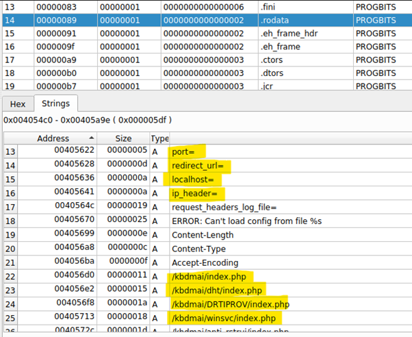 As observed from the PortEx diagram in Figure 3, the binary is not packed and is not protected against anti-reverse and anti-VM techniques — no packed regions were detected. Some strings can be identified inside the .rodata section, which contains static constants hardcoded in the binary.