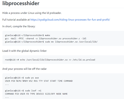 Figure 1: libprocesshider code and usage from GitHub page.