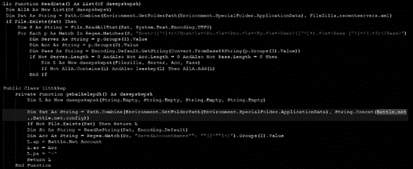 During the analysis, it was observed the malware parses the credential files using Mozilla’s DLLs and nss3 DLL. The next image shows details on Filezilla and Battle.net folders present in the malware source code.