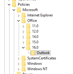 First, let's make sure that their copy of Outlook is closed down. Next, let's navigate to HKCUSoftwarePoliciesMicrosoftOffice (look for a version number here)Outlook.
