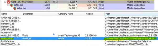 Vivaldi is dropped into the target system along with the malware’s malicious DLLs. Once again, the target DLLs are loaded into the memory using the Vivaldi application in order to avoid detection. The DLL injection technique previously decribed is used again by Vizom.