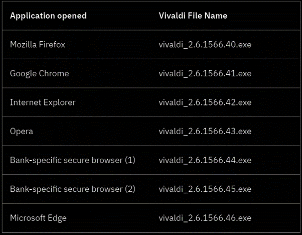 To ensure that the malware is executed every time the user’s device is started, Vizom modifies the browser’s shortcuts and adds the malicious path where the Vivaldi software is installed. When executed, the browser is launched as a child of Vivaldi’s process (see Figure 4 above). The browser’s shortcuts are modified according to the next table.