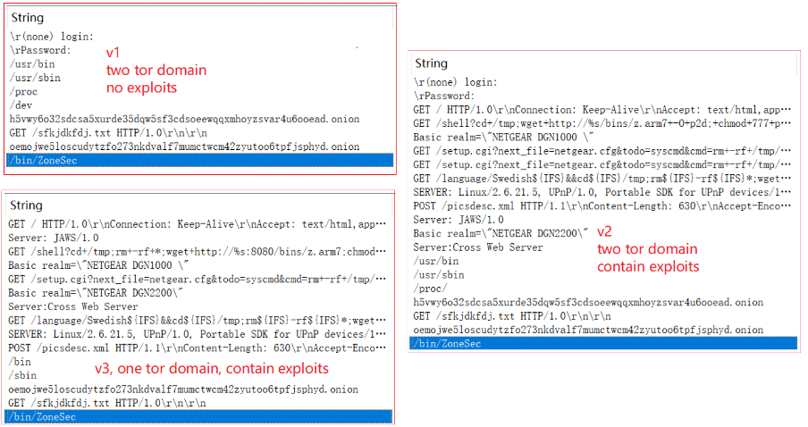 “The currently captured ZHtrap samples can be divided into three versions according to their functions: v1, v2 and v3. V2 adds the function of exploiting the vulnerability on the basis of v1; v3 deletes the network infrastructure on the basis of v2”, the researchers said.