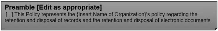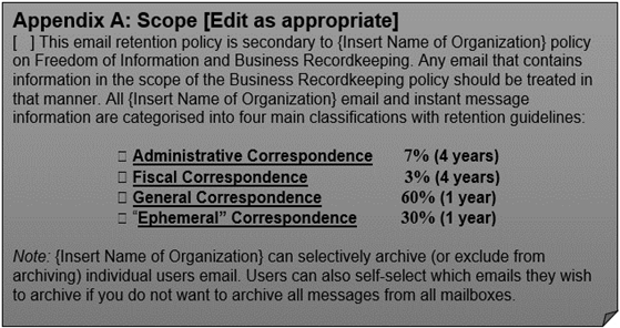 The Scope section, as shown in the text box below, aims to embrace all types of e-mail messages subject to retention rules. Anything left outside should be treated per se as an exception, therefore handled manually. In other ERP versions, this part can also include staff who is entrusted to create, send, receive, or retain e-mail messages and attachments.