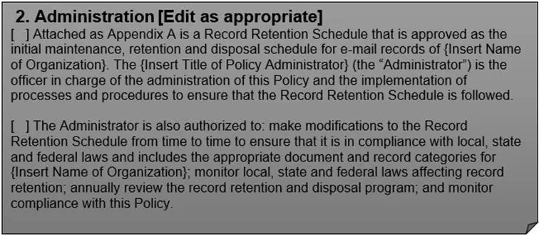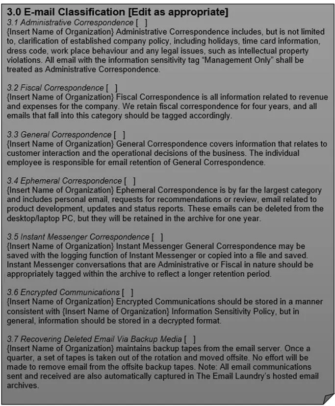 Simply put, an e-mail retention policy/ERP is the process of keeping emails for compliance or business reasons. It differs from archiving (although these terms can be used interchangeably) in the fact that a retention policy decides when to dispose of redundant electronic messages, while the latter may keep them indefinitely. Therefore, an ERP should set forth parameters for which e-mails are to be stored, for how long, and the exact mechanism of their disposal. This schedule must also consider the regulatory timeframes for email preservation and other requirements applicable to your industry, if there are any.