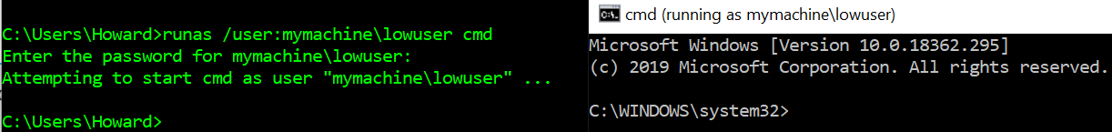In this case, runas was used to run the command prompt using another account with extremely limited privileges (lowuser). The command prompt can now be used to run untrusted commands in a more secure manner. This is because if the application is compromised, it will not have the more elevated privileges of the other account.