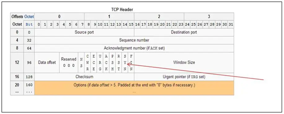 Next, we can see in the options area the couplet flags:S. This is the flags option field. We can designate and look for any flags or any combination of flags in the TCP header. In this case, we are looking for packets with the S or SYN flag set. Remember that the TCP header has a one byte field, or 8 bits, to designate each of the eight flags. So, for the first packet in a TCP 3-way handshake, the second to last bit will be turned on or has a value of one (1), indicating a SYN flag. We can check for these flags by using the keyword flags.