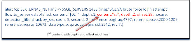 We should already be familiar with the header of this rule. The action is alert, the protocol is tcp, the source IP is a variable defined in snort.conf as $EXTERNAL_NET, the source port is any, the direction is -> toward our network, the destination IP is a variable defined in snort.conf as $SQL_SERVERS and the destination port is SQL Server's default port 1433. The message sent to the Snort admin is "SQL SA brute force login attempt" and the flow is to the server and established, but now we address some new fields and concepts in Snort rules when we come to the content keyword.