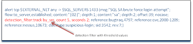 The threshold levels are defined by the number of matches within a period of time. The keywords are relatively intuitive so that the number of matches is defined by the keyword count and the time period is defined by the keyword seconds. In our example rule, we have defined the threshold count as 5 within 2 seconds. This means that if we see five attempted brute force sa logins on our SQL Server application server within 2 seconds, send an alert. Anything less than this threshold level will be ignored. A couple of important notes here about these threshold level detection filters: First, count can be abbreviated as c and seconds can be abbreviated as s, so this detection level could have been written as detection_filter: track by_src c 5 s2. It is recommended, and considered a best practice, to use the full words count and seconds as it makes debugging more intuitive and therefore, much easier. Second, note that these threshold level parameters appear as a couplet like nearly everything else in the option's section of a Snort rule, but this couplet does not have a colon between the first and second part (there is no colon between count and 5, for instance). Third, the detection_filter applies to the entire rule independent of where it appears in the rule. It can be placed anywhere in the options section and applies to the threshold level of triggering the entire rule alert.