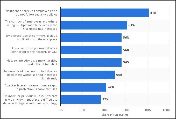 A survey of 694 IT and security professionals in 2016 indicated that employees using multiple mobile devices in the workplace were one of the biggest threats to endpoint security. The biggest threat, though, was negligent employee behavior when it came to following organizations’ security rules and procedures.