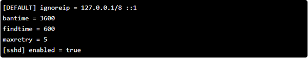 The third line specifies the findtime, which specifies the time within which wrong attempts are issued. In this case, 600 seconds is five minutes. In five minutes, if invalid login attempts are made, the violating IP will be blocked for one hour.