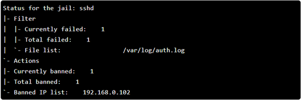 We can see above that fail2ban blocked one IP address after multiple failed login attempts.