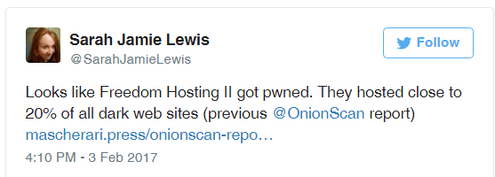 Figure 1 - Sarah Jamie Lewis reported the Freedom Hosting II hack