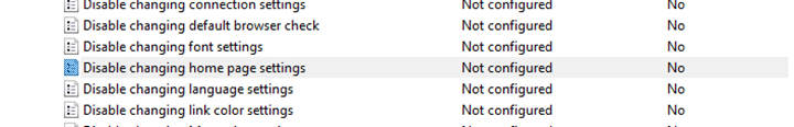 The specific setting we're going to be looking for is “Disable changing home page settings.” While this may not sound like it's what we want at first, it does have the settings required to set a standard home page, and then lock out that setting from user modification.