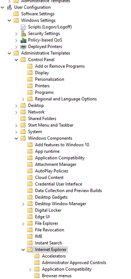 To do this, we'll be going down the User Configuration side, so this means User Configuration → Administrative Templates → Windows Components → Internet Explorer.