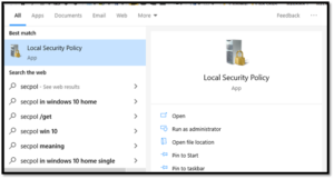 Type “secpol” in the Windows 10 search bar and click on the resulting applet shown.