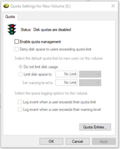 Disk quotas in the context of Windows 10, and by extension Windows Server, revolve around assigning users and user groups limits to how much space they can use in a given storage area. Sometimes this can mean a single physical drive like the C: drive on an individual workstation, right on up to permissions for an entire group on network-attached storage.