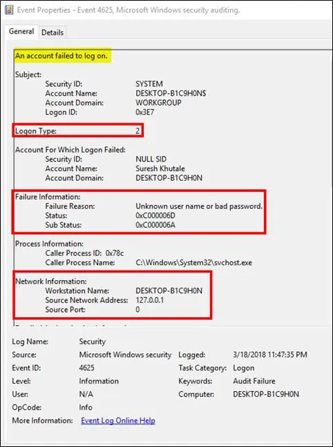 Windows keeps track of the account log on failed activities under Event ID 4625. It provides useful information about each failed logon attempt happening on the system. The following illustration displays the important fields in the Event ID 4625: