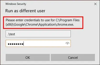 To demonstrate this, I have created a local user "test" with administrators group privileges. I will start a program called Chrome.exe to run as a different user. This is demonstrated in the screenshot below: