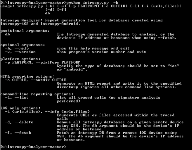Now, we can analyze the database using "introspy-analyzer" which we have downloaded earlier. Navigate to "Introspy-analzer-master" folder and run "introspy.py" file with "–h" switch to see the options available.