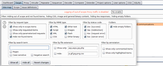- The target has now been added to scope. You can further restrict items shown on the sitemap by clicking on the filter bar and enabling the checkbox that says “Show only in-scope items.” See below: