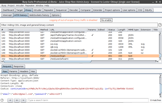 Burp Intruder is used to automate repetitive tasks such as checking for SQLi. To check for SQLi, we shall click on the Login button on the top bar on our juice shop. On our login form, we input dummy credentials and proceed to examine the HTTP history. We decided to enter admin@gmail.com as the username and pass123 as the password.