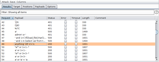 - We can now attempt different payloads, replacing a' or 1=1-- with each of the following. All seemed to return a status code of 200:
