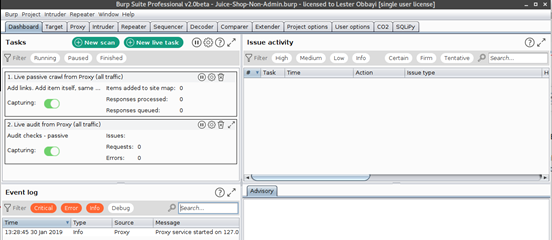 Once you launch your scan, Burp 2.0 includes a new dashboard which you can use to visualize and manage your scans as they run. Using the dashboard, you can now pause and resume individual scans, see descriptions of issues found in real-time and even monitor the event log of the different running scans.