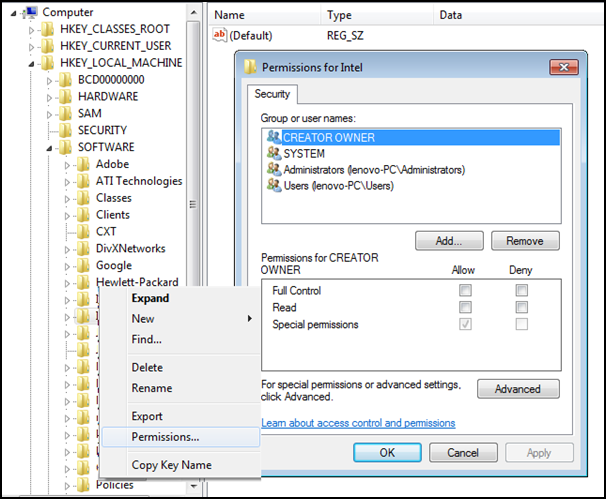Figure 3: Regedit utility to view registry key permission