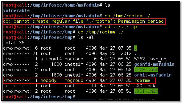 - We copied a binary file on the “/tmp” directory, which has 777 (read, write and execute) permission. The file gets copied in the folder with the privilege of user “nobody”, as shown below.