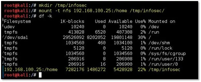 mount -t nfs 192.168.100.25:/home /tmp/infosec