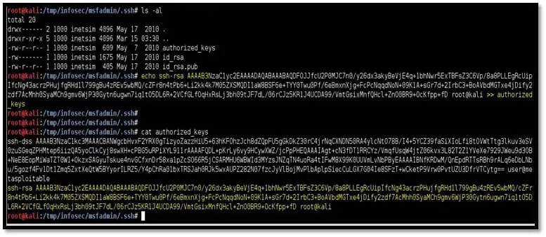 Step 8: Navigate to /tmp/infosec/msfadmin/.ssh folder and append the newly created public key into the authorized_key of the msfadmin user