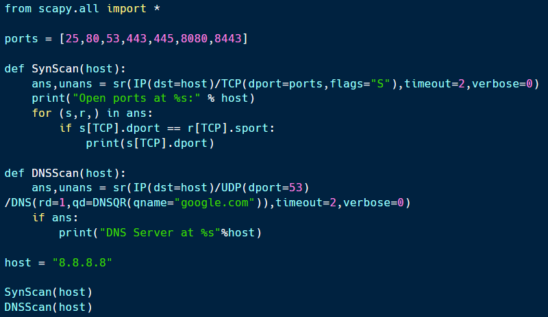 The sample code for this is shown above and available on Github. As shown, this code is designed to perform a SYN scan against a particular IP address and to perform DNS lookups for a domain name.