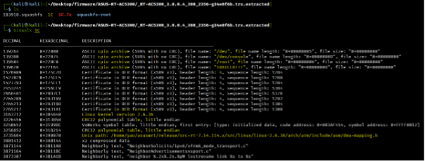 In this laboratory, we will use the model RT-AC5300 from Asus. To see the files embedded in the firmware file, we need to use the binwalk tool. Using the option "-e," all the files can be extracted from the .trx file. [CLICK IMAGES TO ENLARGE]