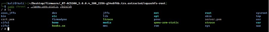 sudo chroot . ./qemu-arm-static /bin/shexport LD_PRELOAD="/firmadyne/libnvram.so"