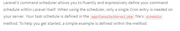 - The Laravel command scheduler works on only a single Cron entry and executes the tasks mentioned in the Kernel.php file.