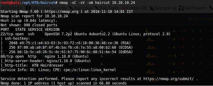<<nmap -sC -sV -oA haircut 10.10.10.24>>