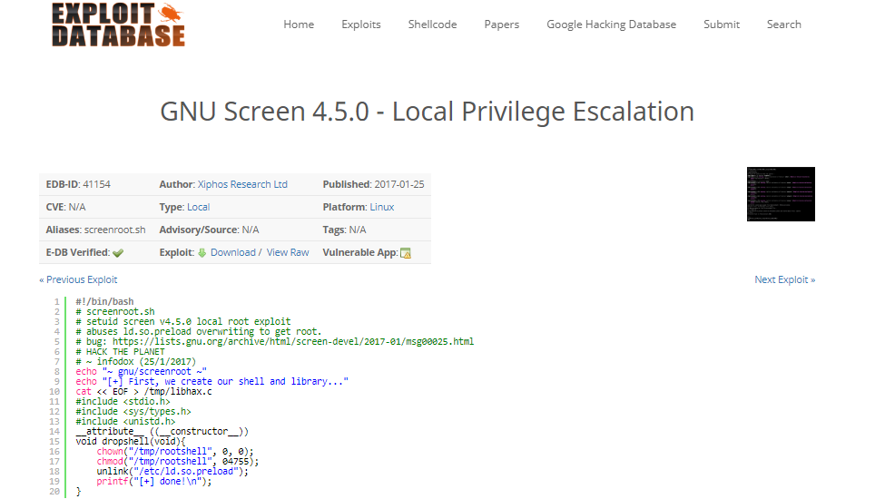18. After enumerating each binary, it was found that the screen version 4.5.0 has a local privilege escalation vulnerability, as shown below.